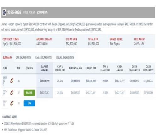 哈登在去年夏天跟快船签下一份两年8150万的合同,本赛季薪水3944万,下赛季薪水4231万(球员选项),本赛季他被交易到骑士时放弃了合同中15%的交易保证金,他加盟骑士队就是为了竞争总冠军,而他的老东家快船已经无缘季后赛。