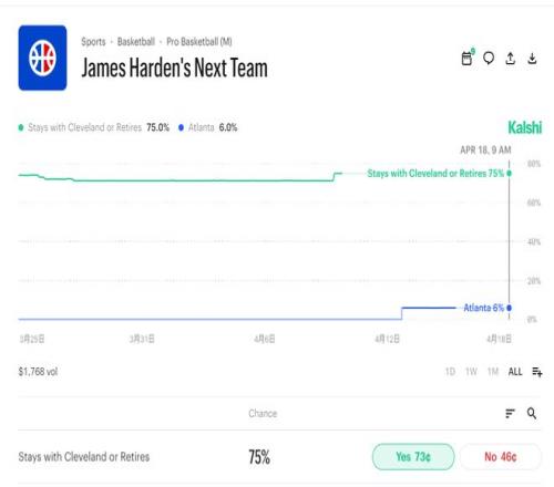 根据数据媒体Kalshi的预测,詹姆斯-哈登留守骑士的概率高达75%,老鹰只有6%,篮网不足1%,因为骑士队内部是对哈登非常满意的,哈登为骑士出战的26场比赛克村拿到20胜6负的傲人战绩 。